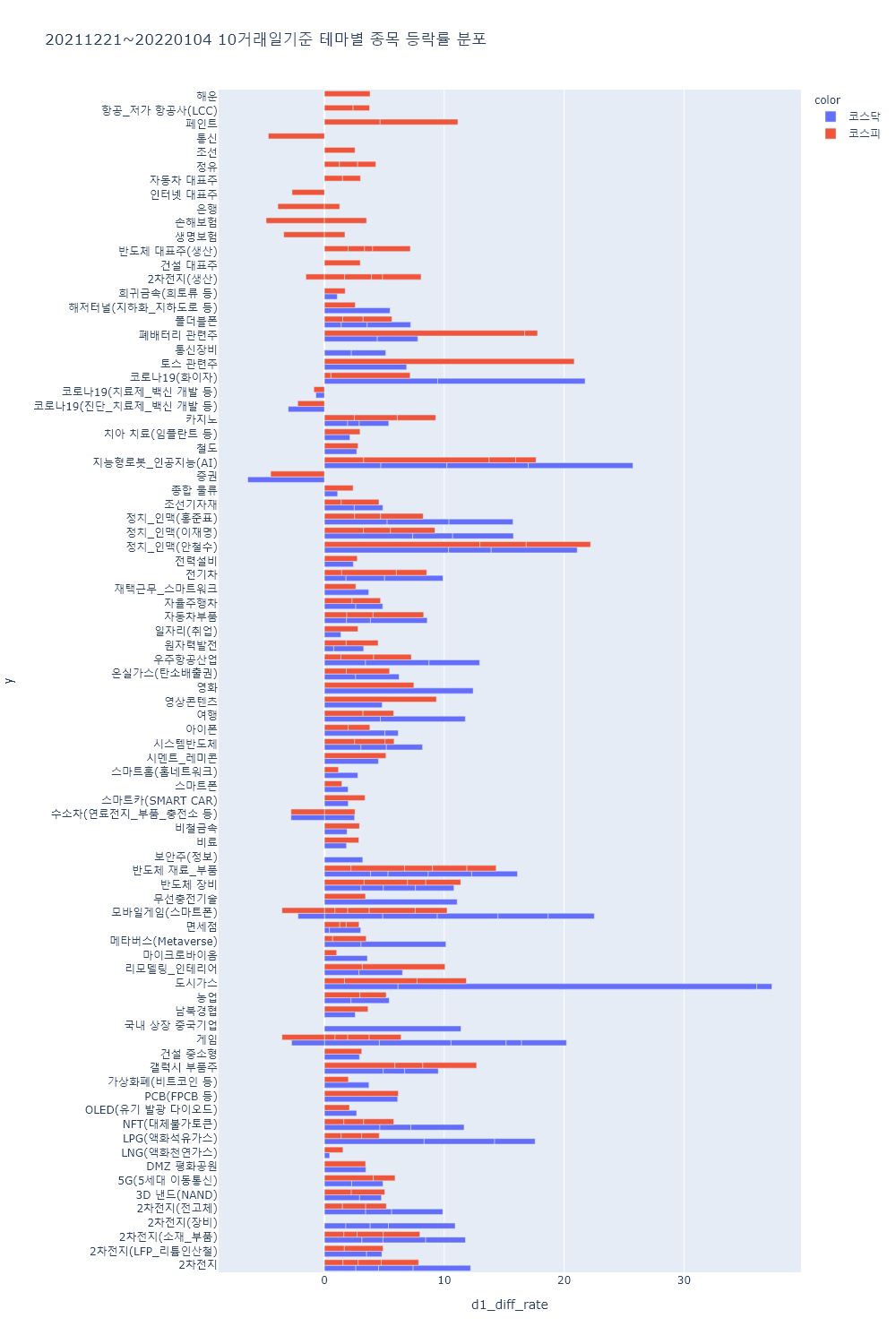 ▷이 외에 음원/음반, mRNA, 가상화폐(비트코인 등), 크래프톤 관련주, 보톡스, 면세점, 항공/저가 항공사 등의 테마가 하락률 상위를 기록.
