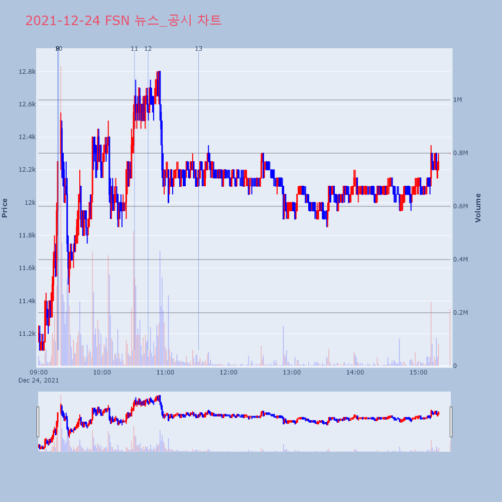 | 13 | [장중수급포착] FSN, 외국인/기관 동시 순매수… 주가 +10.00% [서울=뉴스핌] 로보뉴스 = 24일 11시 30분 현재 | 뉴스핌 | FSN | 2021-12-24 11:31:37 |
