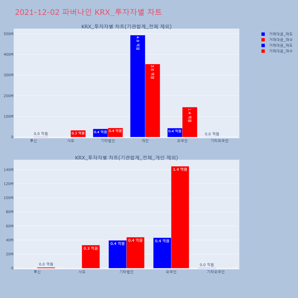 | 투자기관 | 거래량_매도 | 거래량_매수 | 거래량_순매수 | 거래대금_매도 | 거래대금_매수 | 거래대금_순매수 |