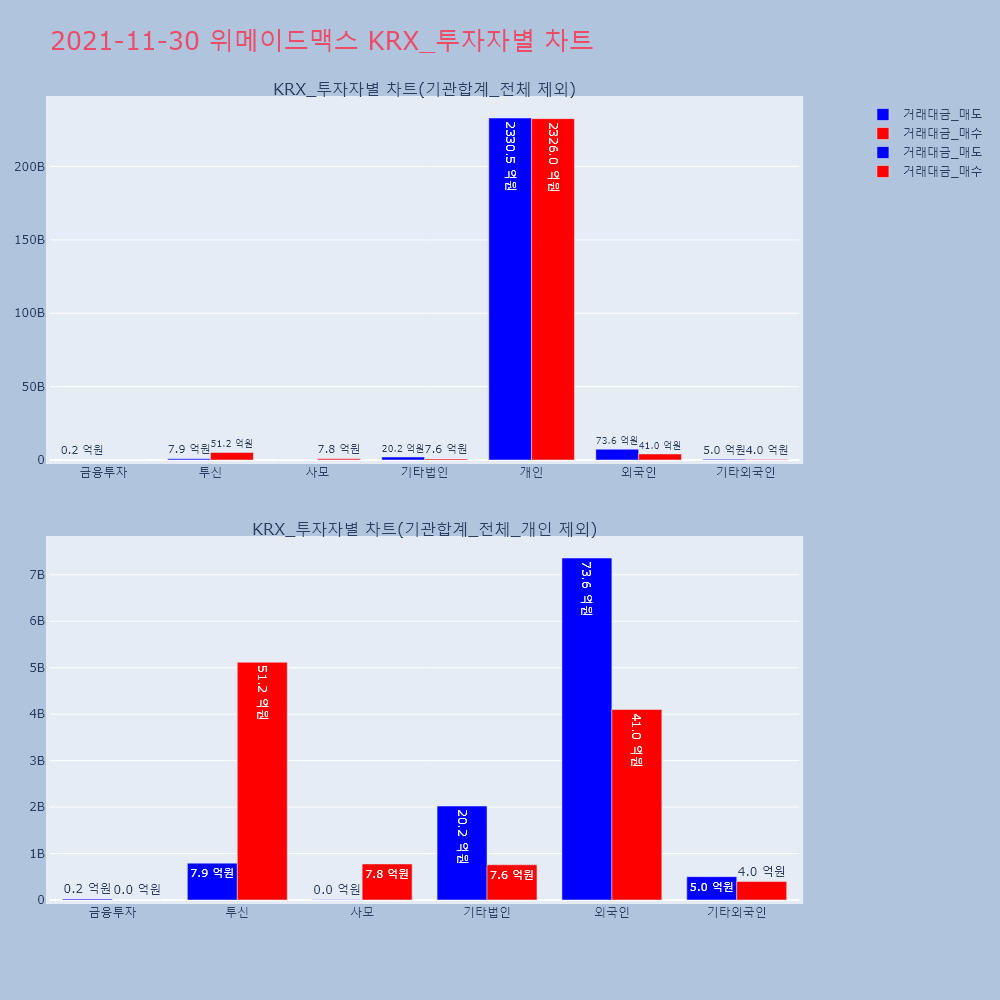 | 투자기관 | 거래량_매도 | 거래량_매수 | 거래량_순매수 | 거래대금_매도 | 거래대금_매수 | 거래대금_순매수 |