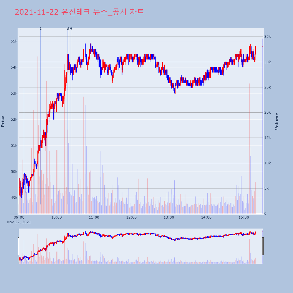 | 2 | [장중수급포착] 유진테크, 외국인/기관 동시 순매수… 주가 +11.16% [서울=뉴스핌] 로보뉴스 = 22일 10시 15분 현재 | 뉴스핌 | 유진테크 | 2021-11-22 10:17:58 |