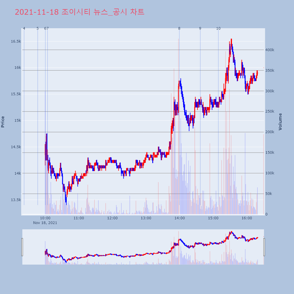 | 2 | [특징주]조이시티, 위믹스 플랫폼 활용 게임 출시 기대감 '상승세'[아시아경제 이선애 기자] 조이시티 주가가 상승세를 보 | 아시아경제 | 조이시티 | 2021-11-17 10:59:48 |