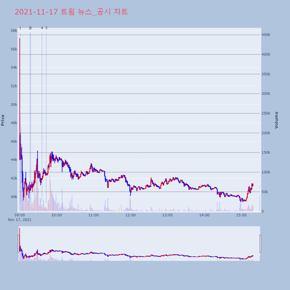 | 2 | [특징주] 트윔, 상장 첫날 7%↓… 시초가 4만4000원 제목 : [특징주] 트윔, 상장 첫날 7%↓… 시초가 | 인포스탁 | 트윔 | 2021-11-17 09:16:47 |