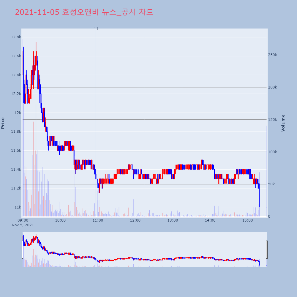 | 11 | 효성오앤비, -7.76% VI 발동효성오앤비(097870)가 VI가 발동했다. 전일 대비 | 조선경제 | 효성오앤비 | 2021-11-05 10:57:07 |