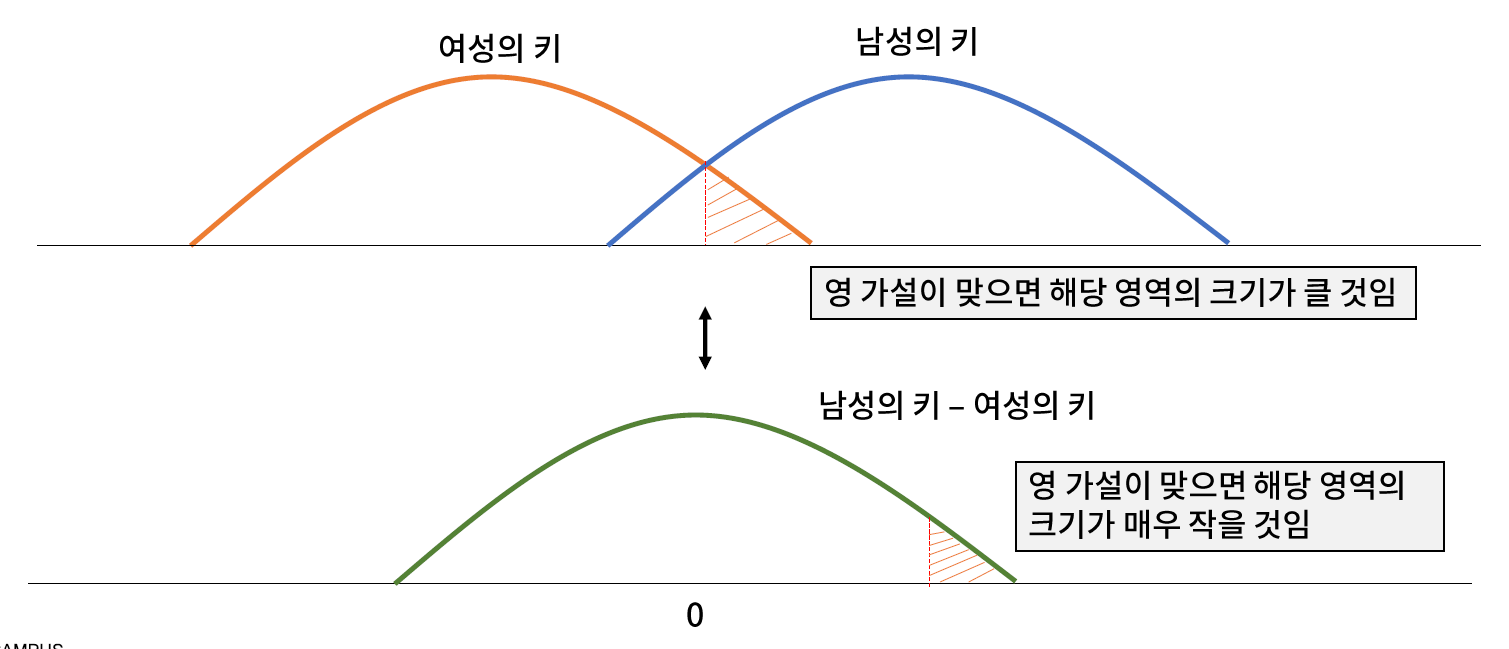 - 영 가설 : 대란민국 성인 남성의 키는 여성의 키와 같을 것이다.