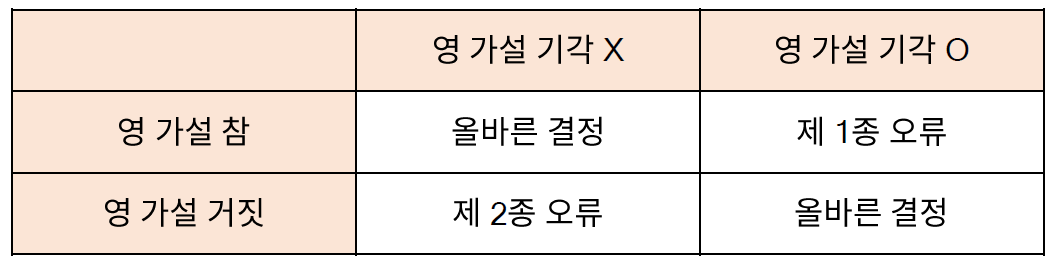 - 영 가설 (null hypothesis)와 대립 가설(alternative hypothesis)로 구분하여, 가설을 수립해야 한다.