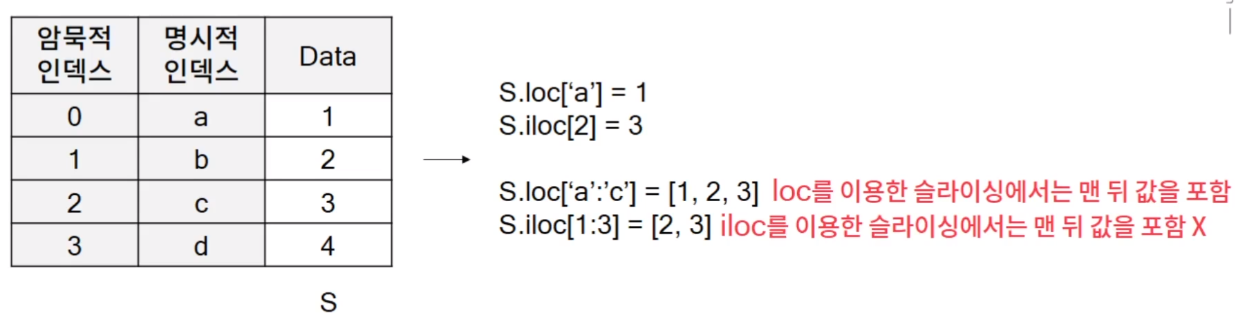 - 판다스의 객체는 암묵적인 인덱스(위치 인덱스)와 명시적인 인덱스라는 두 종류의 인덱스가 있어, 명시적인 인덱스를 참조하는 loc 인덱서와 암묵적인 인덱스를 참조하는 iloc 인덱서가 존재한다.