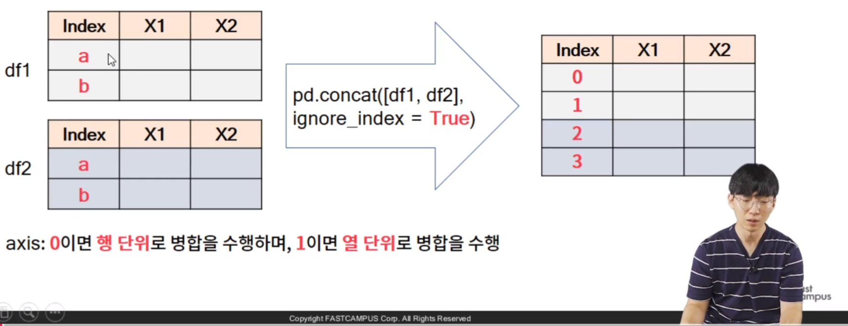 . axis -> 0 이면 row 단위로 병합을 수행하며, 1 이면 column 단위로 병합을 수행한다.