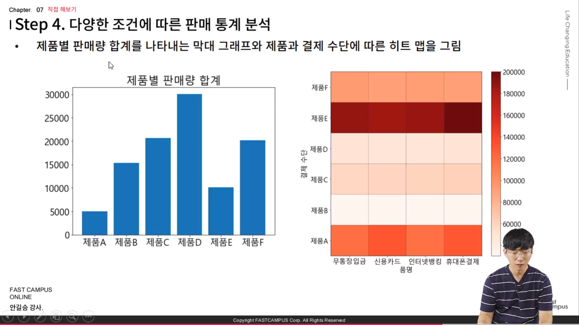 - 제품별 판매량 합계를 나타내는 막대 그래프와 제품과 결제 수단에 따른 히트 맵을 그린다.