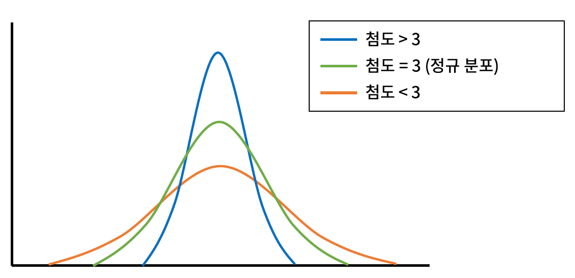 - 첨도 (kurtosis) : 데이터의 분포가 얼마나 뾰족한지를 의미한다. 즉, 첨도가 높을수록 이 변수가 좁은 범위에 많은 값들이 몰려있다고 할 수 있다.