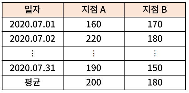 - 가설 수립 예시 : 2020년 7월 한 달 간 지점 A의 일별 판매량과 지점 B의 일별 판매량이 아래와 같다면, 지점 A와 지점 B의 7월 판매량 간 유의미한 차이가 있는가?