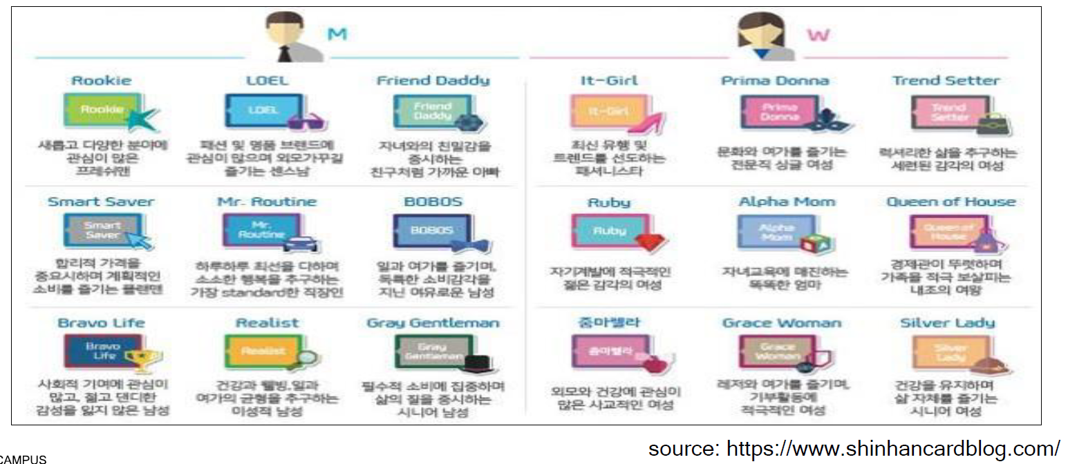 - 신한카드에서는 카드 사용 패턴에 대한 군집화 결과를 바탕으로 고객을 총 18개의 군집으로 구분한다.
