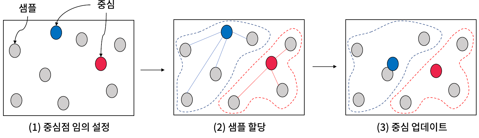 - (1) k개의 중심점 설정, (2) 샘플 할당, (3) 중심점 업데이트를 반복하는 방식으로 k개의 군집을 생성하는 알고리즘