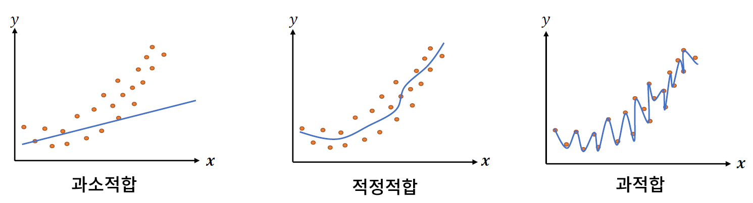 - 모델이 너무 족잡해서 학습 데이터에 대해서만 정확히 분류하고 예측하는 모델을 과적합되었다고 하며, 반대로 너무 단순해서 어떠한 데이터에 대해서도 부적합한 모델을 과소적합되었다고 한다.