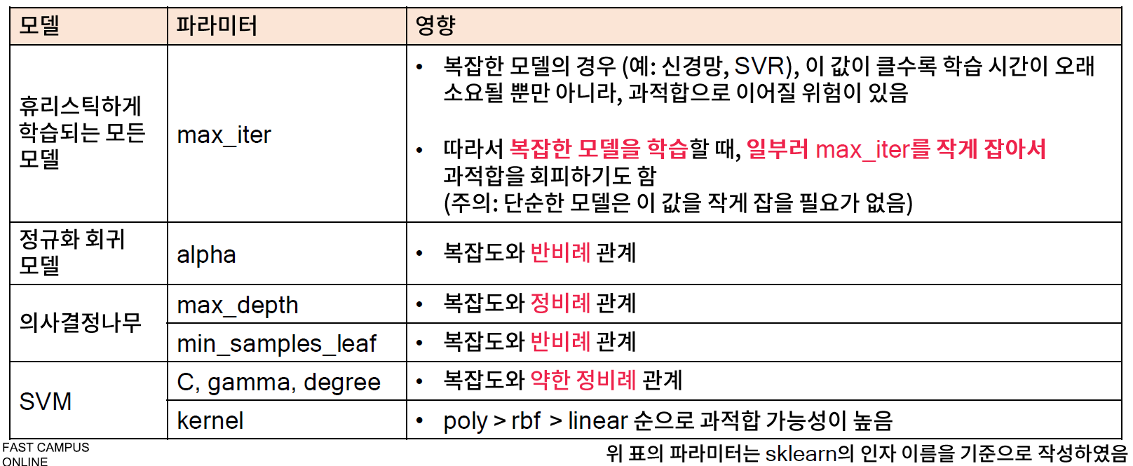 - 복잡도 파라미터란 복잡도에 영향을 주는 파라미터로, 이 값에 따라 과적합 정도가 결정되므로 매우 신중하게 튜닝해야 한다.
