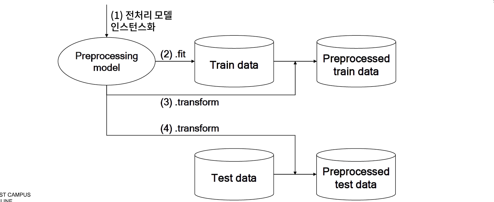 - sklearn 을 이용한 대부분의 전처리 모델의 활용 과정의 이해는 매우 중요하며, 특히 평가 데이터는 전처리 모델을 학습하는데 사용하지 않음에 주목해야 한다.
