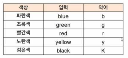 . x, y: x, y 축에 들어갈 값 (iterable한 객체여야 하며, x[ i ], y[ i ] 가 하나의 점이 되므로 두 입력의 길이가 같아야 한다.