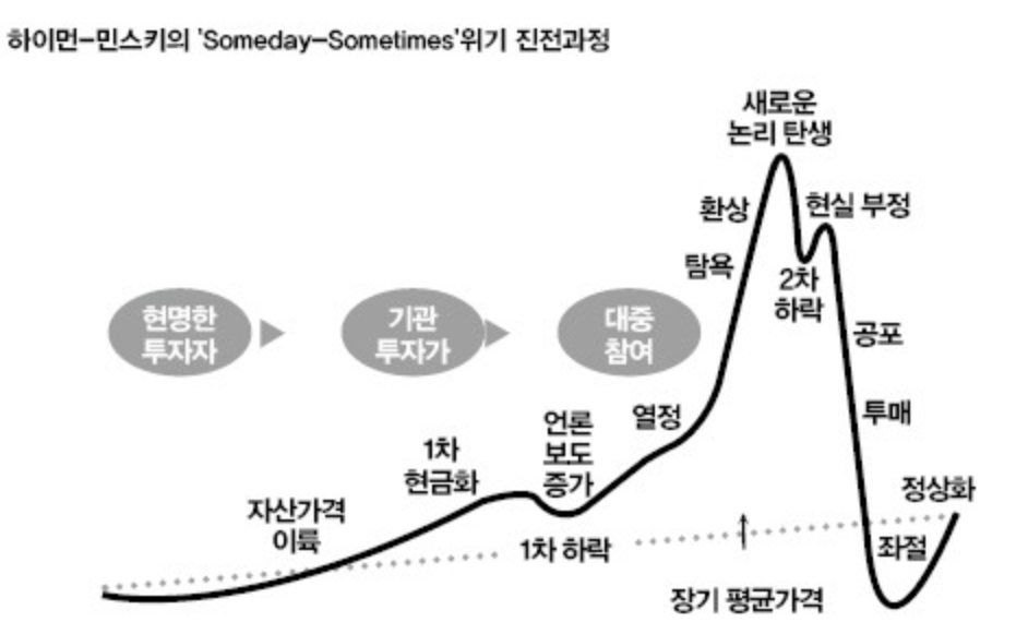 ◆민스키 모멘트(Minsky Moment)란 과도한 부채로 인한 경기 호황이 끝나고, 채무자의 부채상환능력 악화로 건전한 자산까지 팔기 시작하면서 자산가치가 폭락하고 금융위기가 시작되는 시기를 의