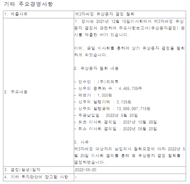 | 0 | [기재정정]주요사항보고서(전환사채권발행결정) | 20220523000263 | 20220523 | https://dart.fss.or.kr/dsaf001/main.do?rcpNo=20220523000263 |