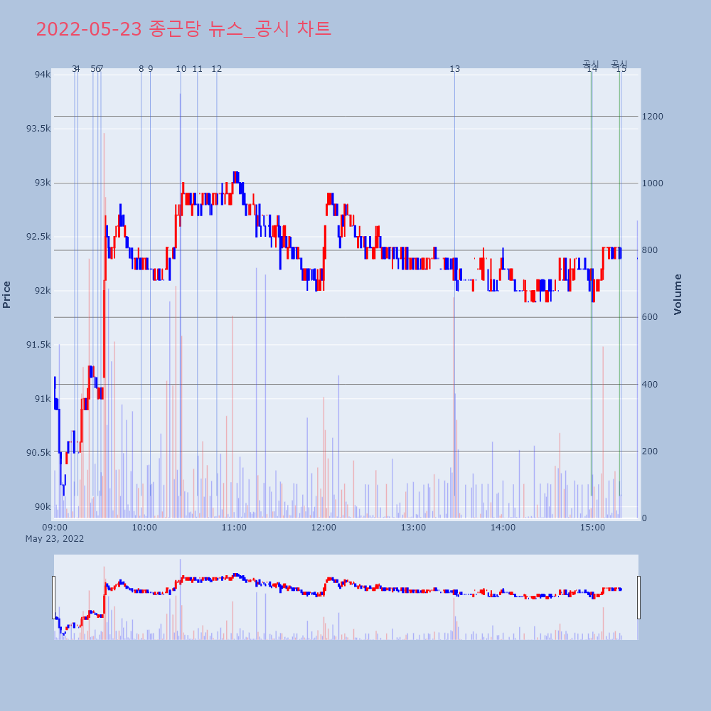 | 13 | [특징주] 종근당, 박스터코리아 난소암 치료제 국내 독점판매 계약에 ↑ 제목 : [특징주] 종근당, 박스터코리아 난소암 치료제 | 인포스탁 | 종근당 | 2022-05-23 13:27:39 |