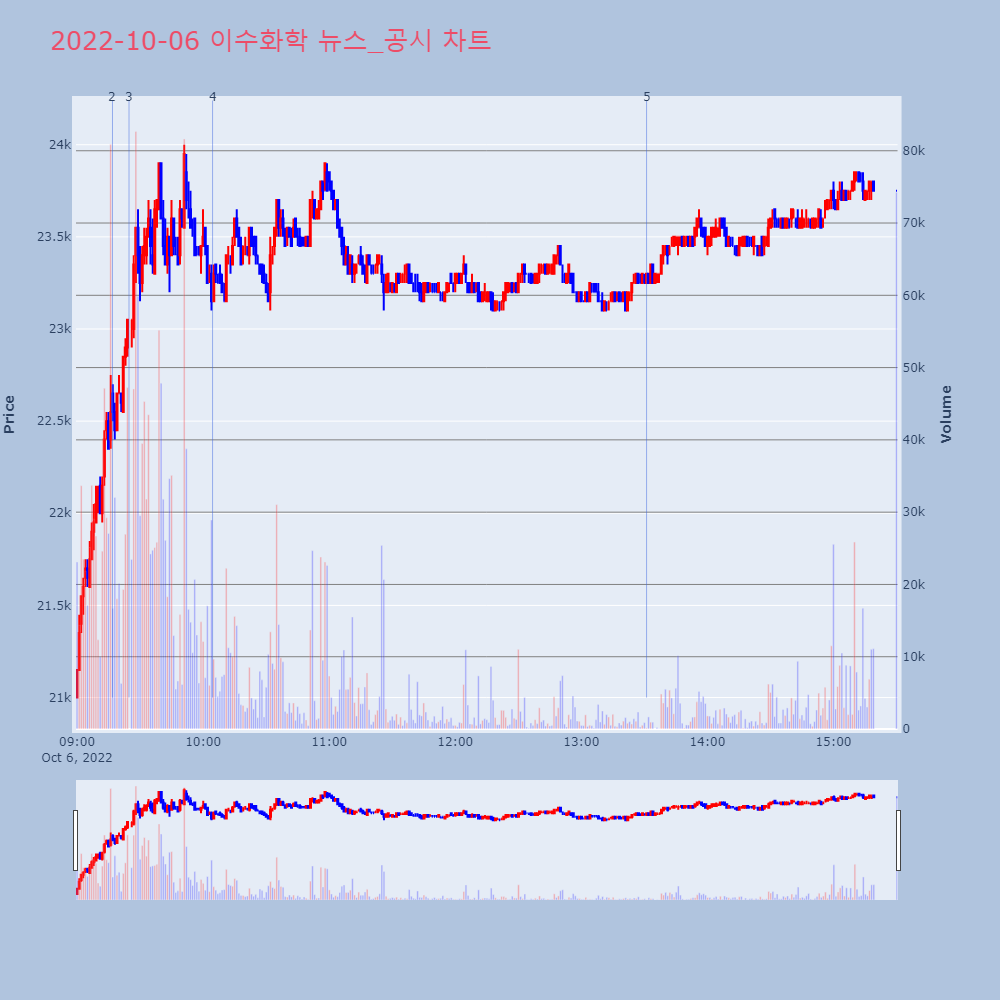 | 4 | [특징주] 한화솔루션, 美 생산설비 증설 태양광 이익 개선 기대감에 2%↑ 제목 : [특징주] 한화솔루션, 美 생산설비 증설 태양 | 인포스탁 | 한화솔루션 | 2022-10-05 09:51:00 |