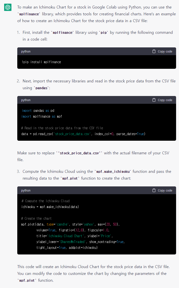 일목균형표(Ichimoku Chart) 파이썬 코드(feat. chatGPT) Programming/Python2023. 2. 24. 21:43