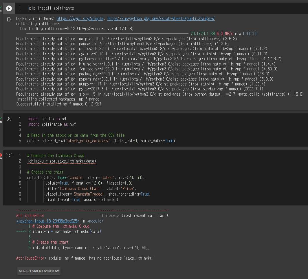 아마도 mplfinance 라이브러리가 뭔가 업데이트가 되면서 mpf.make_ichimoku 모듈이 없나봐요.