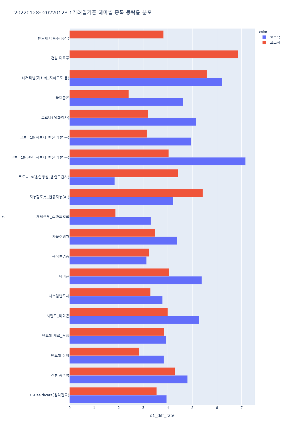 ▷국내 코로나19 신규 확진자 2만2,773명, 사상 최다치 재경신 등에 코로나19(진단/치료제/백신 개발 등), 재택근무/스마트워크, U-Healthcare(원격진료) 등 코로나19 관련주 상승. 특히, 방역체계 전환에 따른 수혜 기대감 지속 등에 코로나19(진단키트) 테마는 급등.