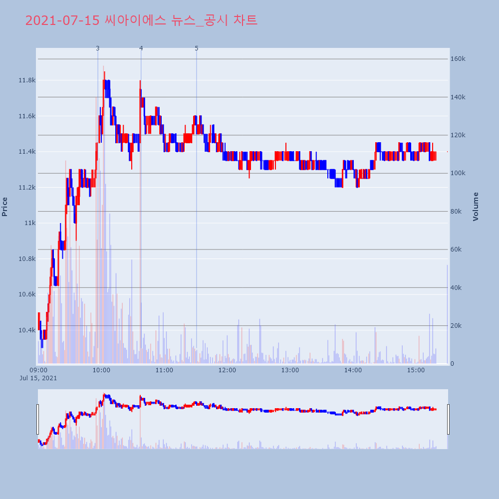 | 2 | 3 | 씨아이에스, +10.10% VI 발동씨아이에스(222080)가 VI가 발동했다. 전일 대비 | 조선경제 | 씨아이에스 | 2021-07-15 09:56:41 |