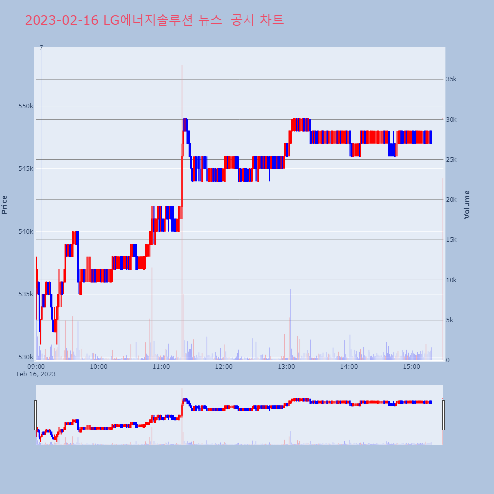 | 4 | [업종 대표주] 전기제품: LG에너지솔루션 +2.67% 출발전기제품 업종 대표주인 LG에너지솔루션이 2.67% 상 | 조선경제 | LG에너지솔루션 | 2023-02-15 09:05:02 |