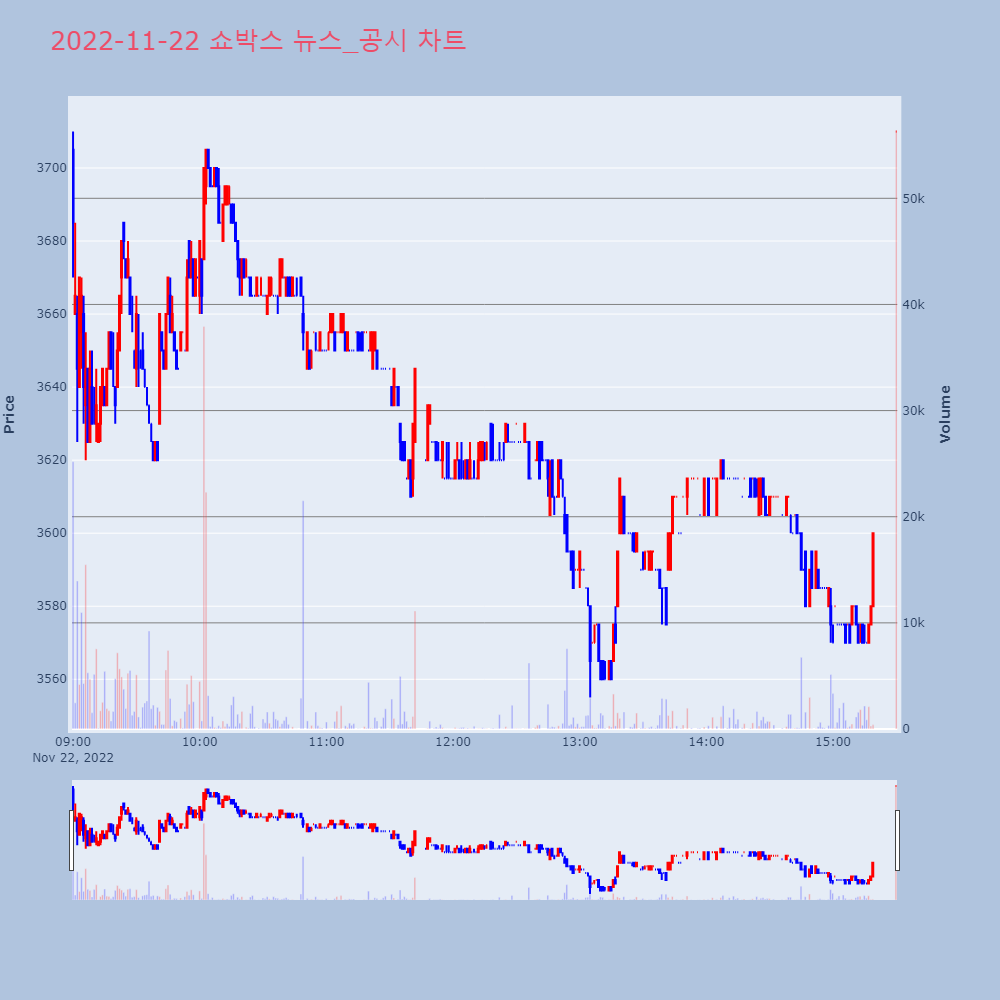 | 3 | [시간외Y] 쇼박스, NEW, 알로이스 '상한가'[프라임경제] 재테크와 투자, 부동산 등에 대한 관심이 | 프라임경제 | 쇼박스 | 2022-11-22 18:36:05 |