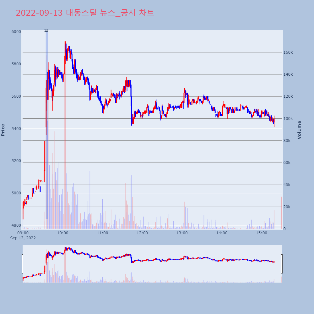 | 3 | 동국제강, +14.79% VI 발동동국제강이 VI가 발동했다. 전일 대비 14.79% 상 | 조선경제 | 동국제강 | 2022-09-13 10:09:06 |