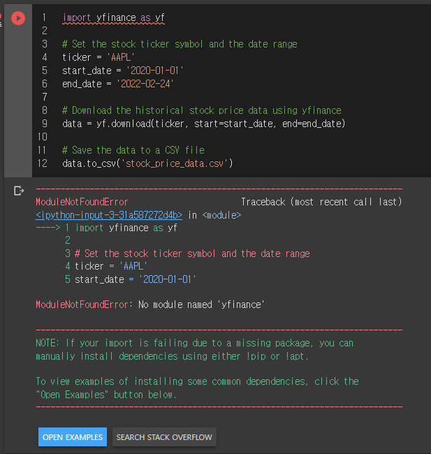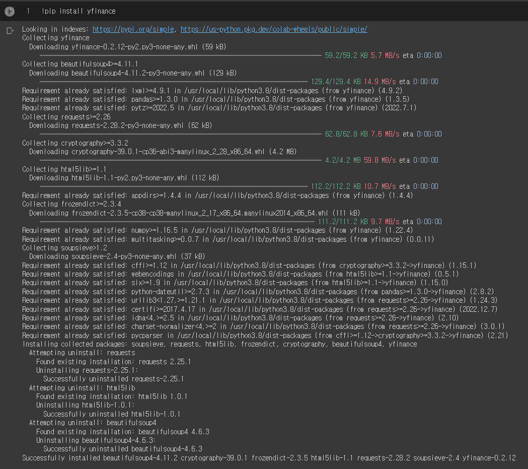 전 구글코랩을 자주 이용하기 때문에 yfinance가 설치가 안되어 있어서 에러가 날줄? 알지만. 걍 복붙 해봅니다.ㅎ
