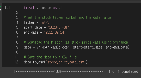 This code will download the historical stock price data for Apple (AAPL) from January 1, 2020 to February 24, 2022 and save it to a CSV file named stock_price_data.csv in the current directory. You can modify the code to download the data for a different stock and date range by changing the ticker, start_date, and end_date variables.