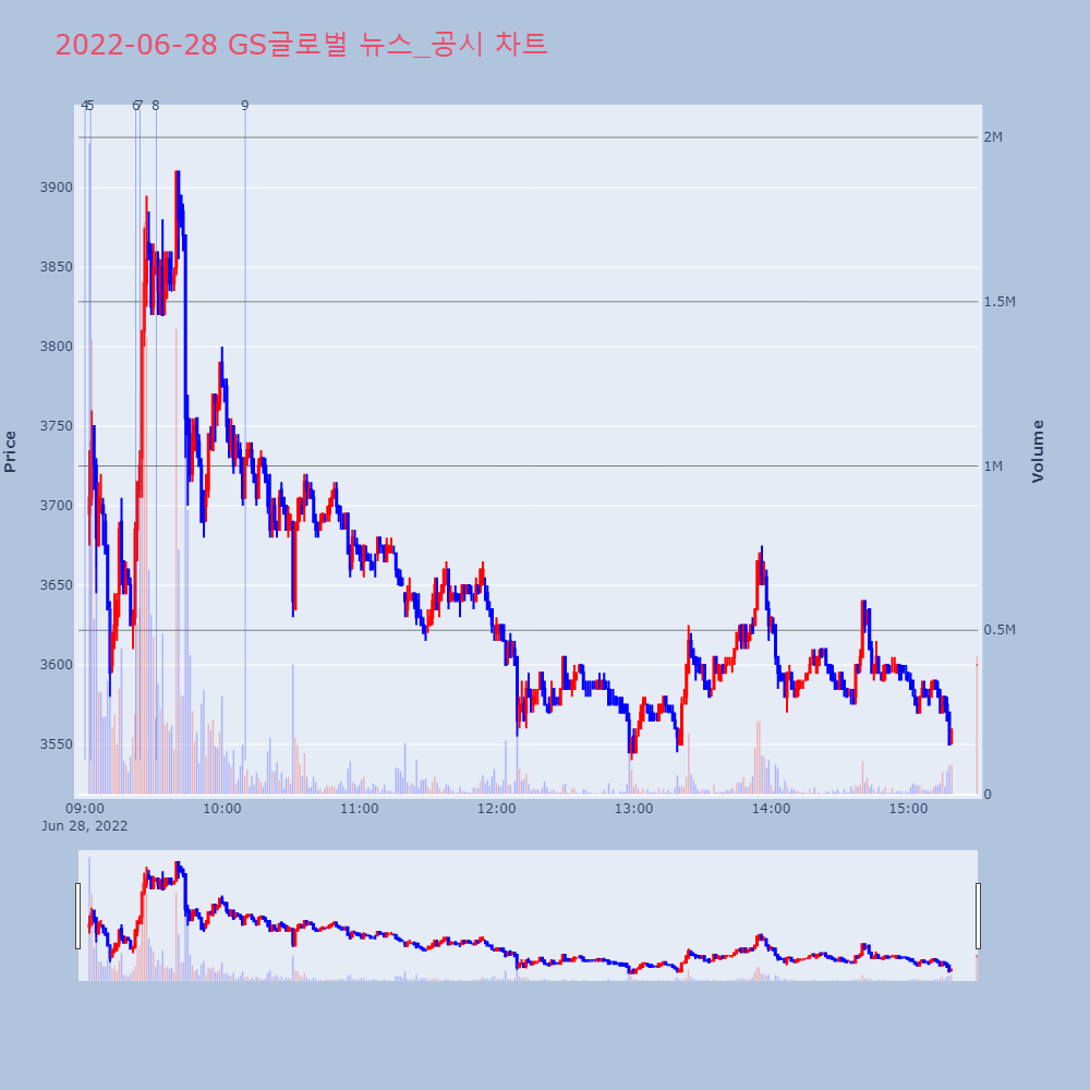 | 6 | [장초반 인기 검색 종목 PICK5] - 까스텔바작, GS글로벌, 삼부토건... 최적의 매매타이밍을 실시간으로 전송하여 투자자들에게 도 | 파이낸셜 | GS글로벌 | 2022-06-28 10:10:08 |