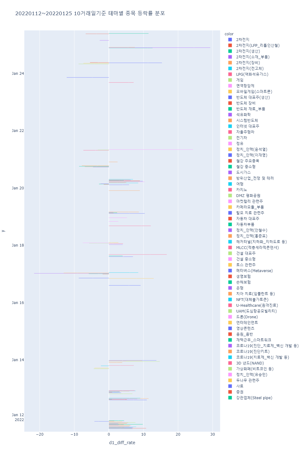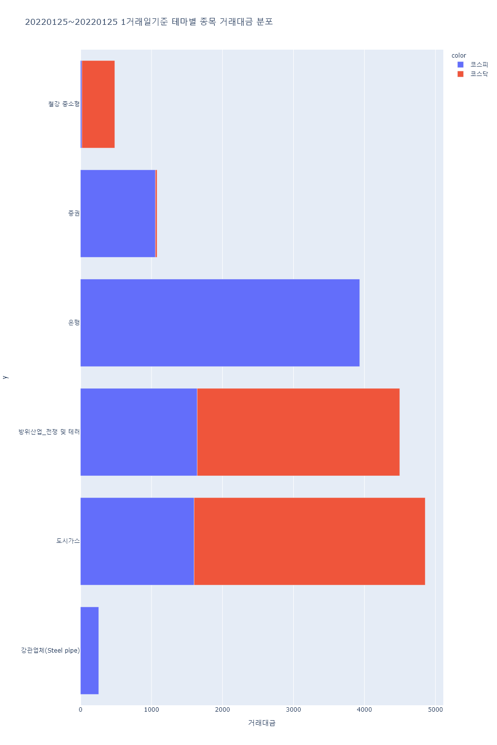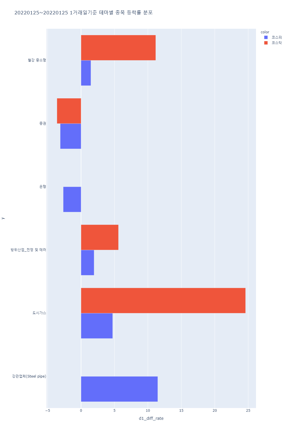 ▷이 외 Fed 긴축 우려 지속, 러시아-우크라이나 지정학적 리스크 고조 등에 국내 증시가 연일 하락한 가운데 증권 테마가 하락했고, 웹툰, 마리화나(대마), 국내 상장 중국기업, 탈모 치료 관련주, 캐릭터상품, 4대강 복원, 엔젤산업, 터치패널, 영상콘텐츠, 증강현실(AR), 폐기물처리, 온실가스(탄소배출권) 등의 테마가 하락률 상위를 기록하는 등 대부분 테마가 하락.