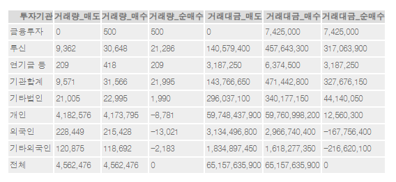 | 외국인 | 12,531 | 22,418 | 9,887 | 529,393,500 | 959,805,000 | 430,411,500 |