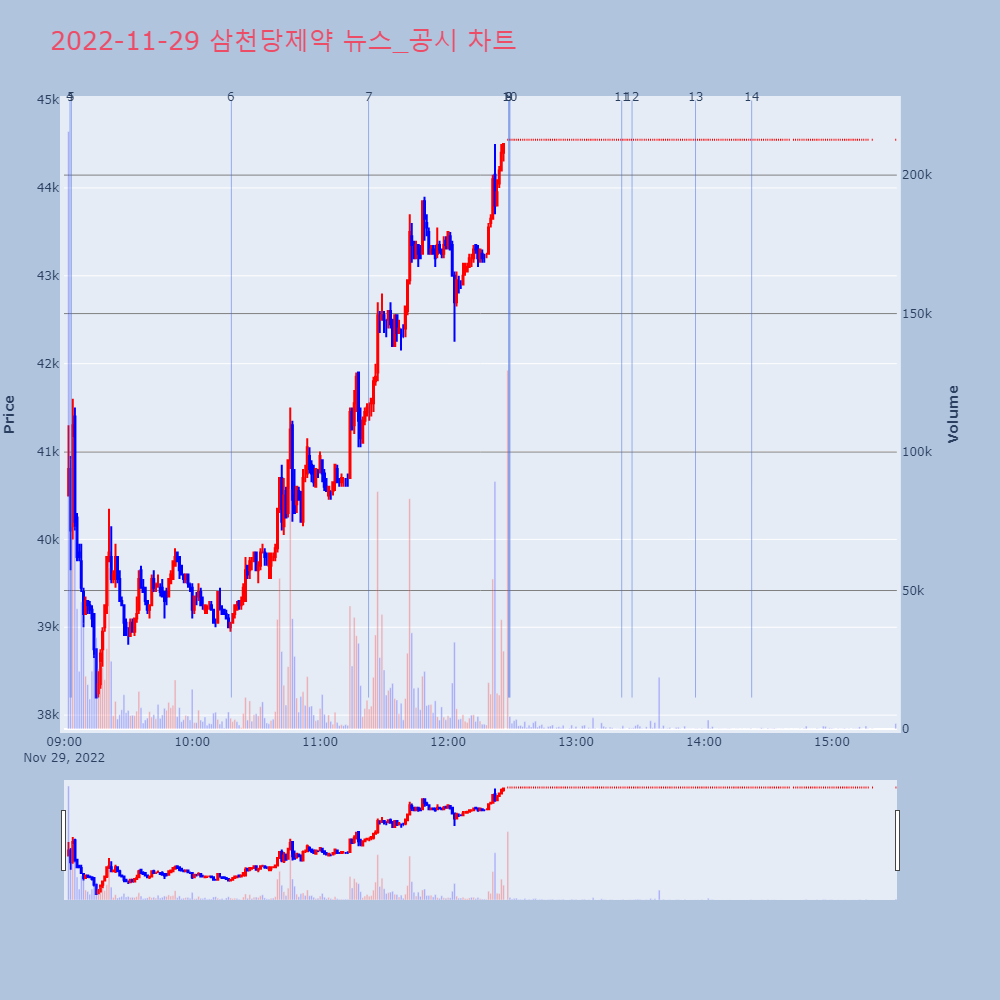 | 15 | [특징주] 삼천당제약, 상한가...바이오시밀러 유럽 공급 확정 제목 : [특징주] 삼천당제약, 상한가...바이오시밀러 | 인포스탁 | 삼천당제약 | 2022-11-29 16:56:04 |