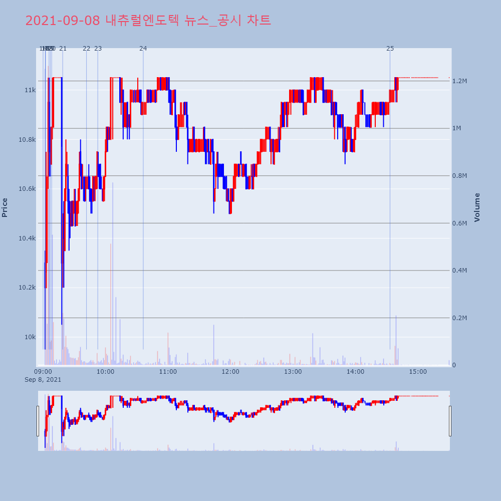 | 24 | [특징주] 내츄럴엔도텍, 거래 재개에 3거래일 연속 '급등' 제목 : [특징주] 내츄럴엔도텍, 거래 재개에 3거래일 | 인포스탁 | 내츄럴엔도텍 | 2021-09-08 10:36:17 |