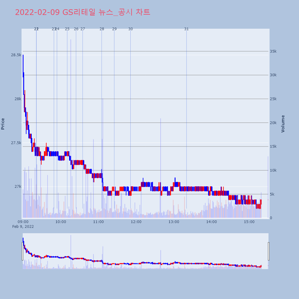 | 30 | [특징주] GS리테일, '갈피 못잡네' 실적 혹평에 5%대 약세 제목 : [특징주] GS리테일, '갈피 못잡네' 실적 | 인포스탁 | GS리테일 | 2022-02-09 11:51:03 |
