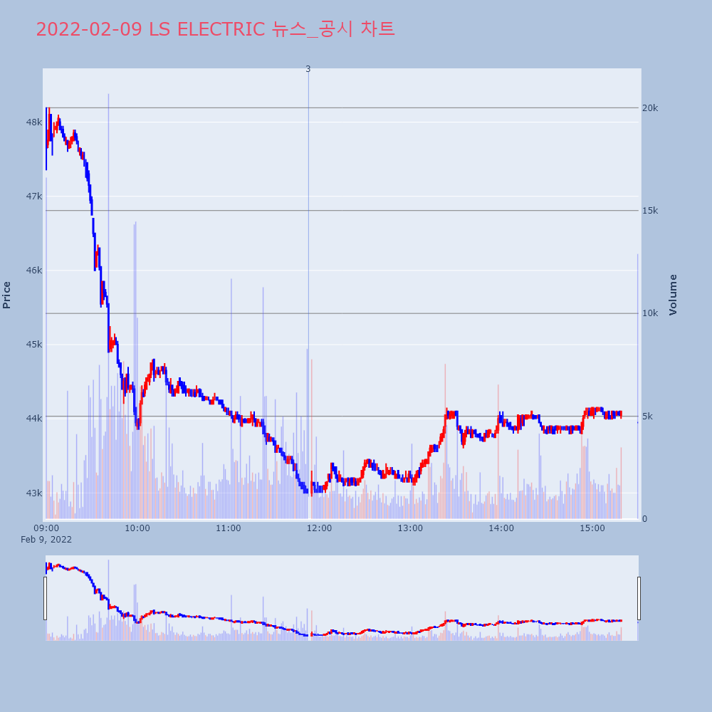 | 4 | [fnRASSI]장마감, 거래소 하락 종목(LS ELECTRIC -10.2% ↓) 09일 거래소 기준으로 하락한 종목은 LS ELECTR | 파이낸셜 | 동양3우B | 2022-02-09 15:37:47 |