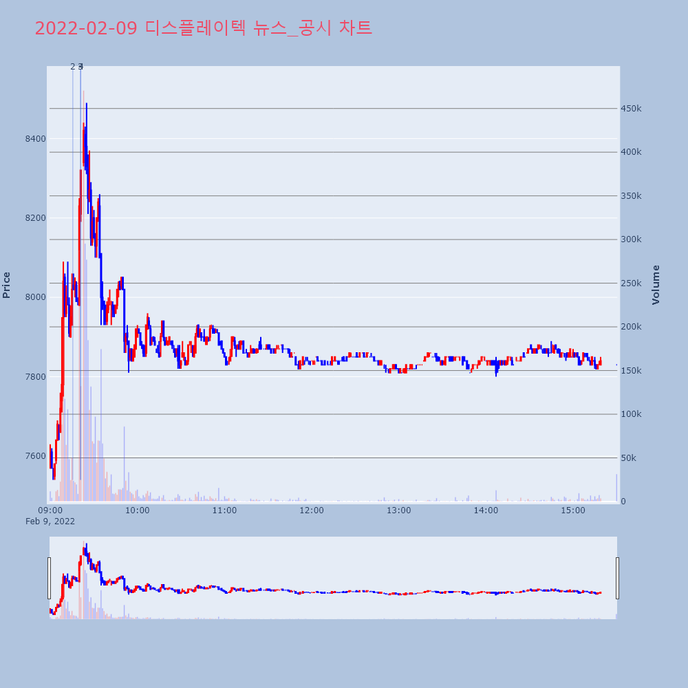 | 4 | 디스플레이텍, +12.43% VI 발동디스플레이텍(066670)이 VI가 발동했다. 전일 대 | 조선경제 | 디스플레이텍 | 2022-02-09 09:21:05 |