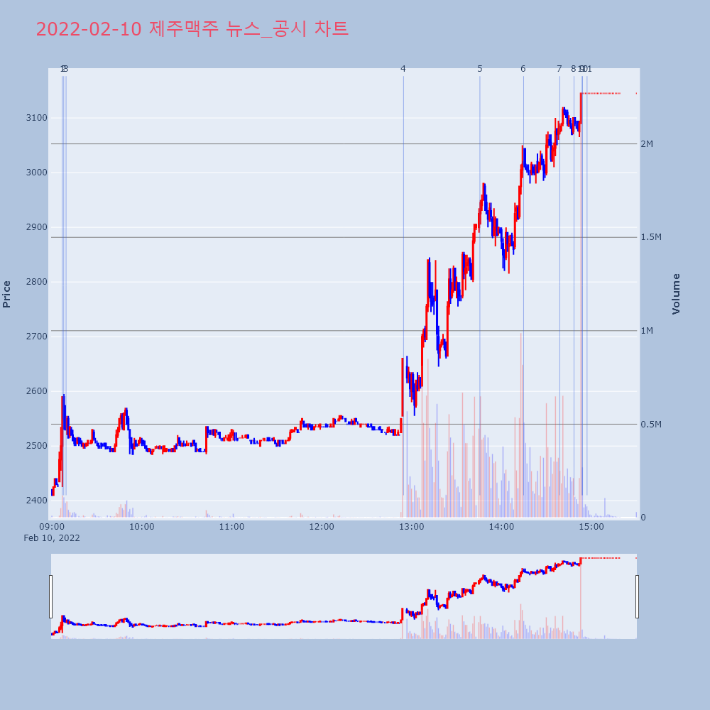 | 13 | [특징주] 주류 가격 인상 조짐에 관련주 급등…제주맥주 상한가[특징주] 주류 가격 인상 조짐에 관련주 급등…제주맥주 | 연합뉴스 | 제주맥주 | 2022-02-10 16:25:33 |