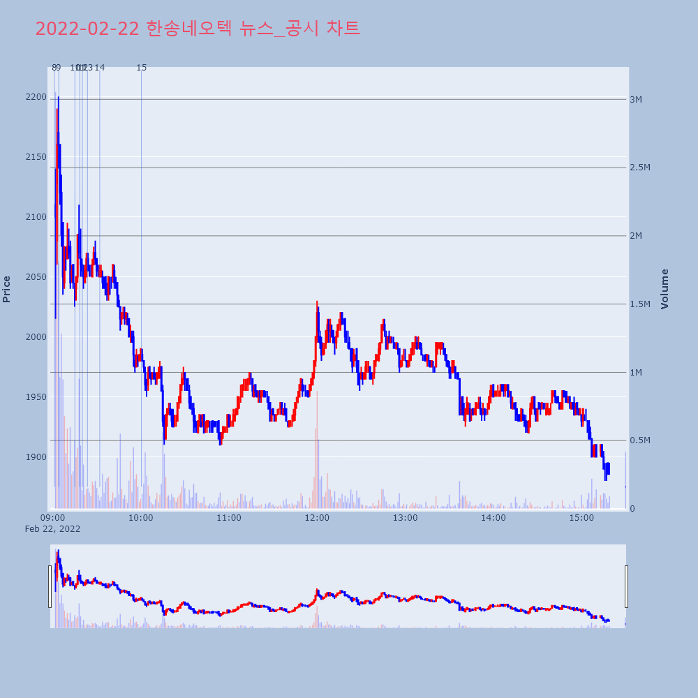 | 15 | [장초반 인기 검색 종목 PICK5] - 한송네오텍, 지에스이, 일동제약... 최적의 매매타이밍을 실시간으로 전송하여 투자자들에게 도 | 파이낸셜 | HMM | 2022-02-22 10:00:27 |