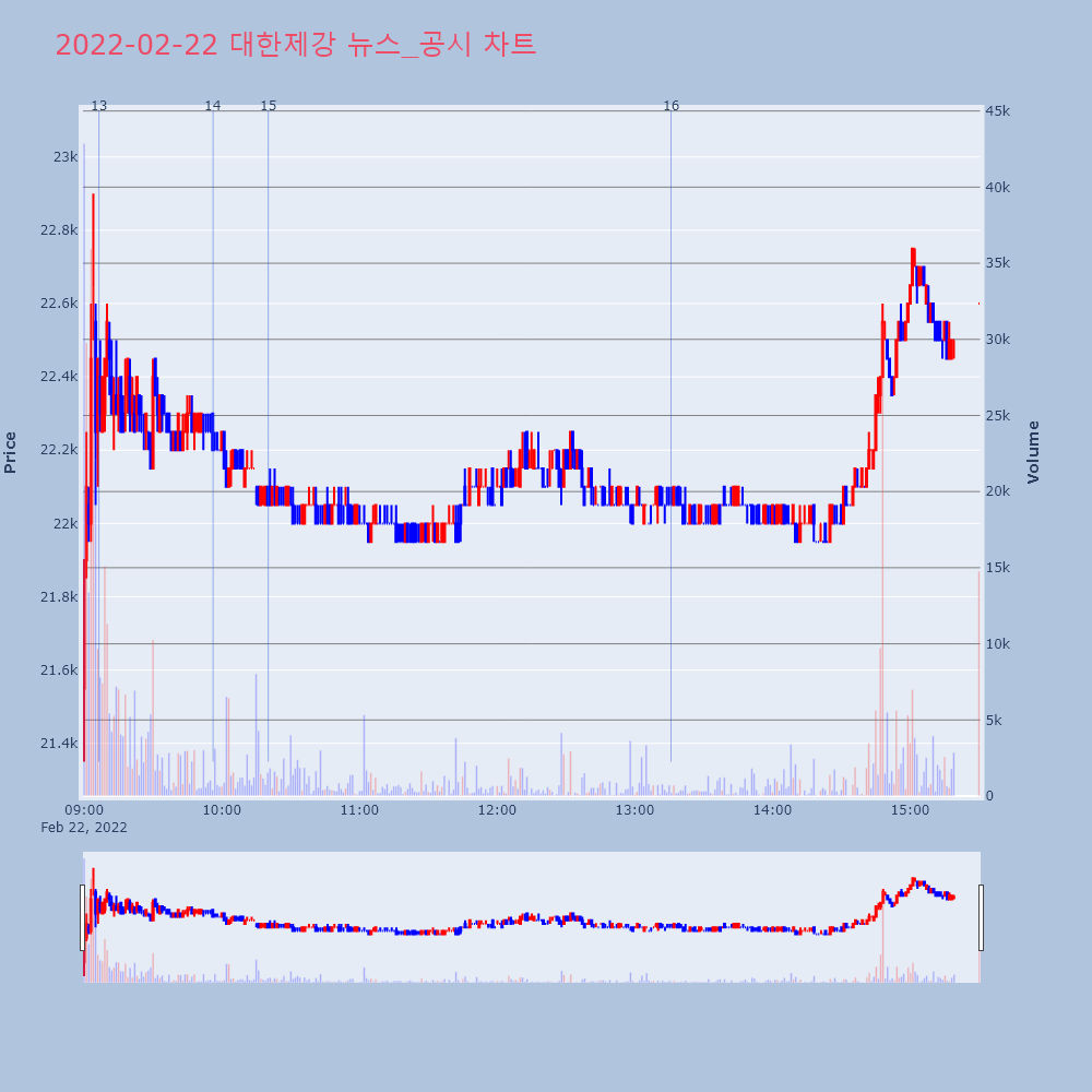 | 13 | [강세 토픽] 건자재 - 철근 테마, 대한제강 +3.98%, 한국철강 +3.00%[건자재 - 철근] 테마가 강세다. 전일 대비 2.11 | 조선경제 | 대한제강 | 2022-02-22 09:06:27 |