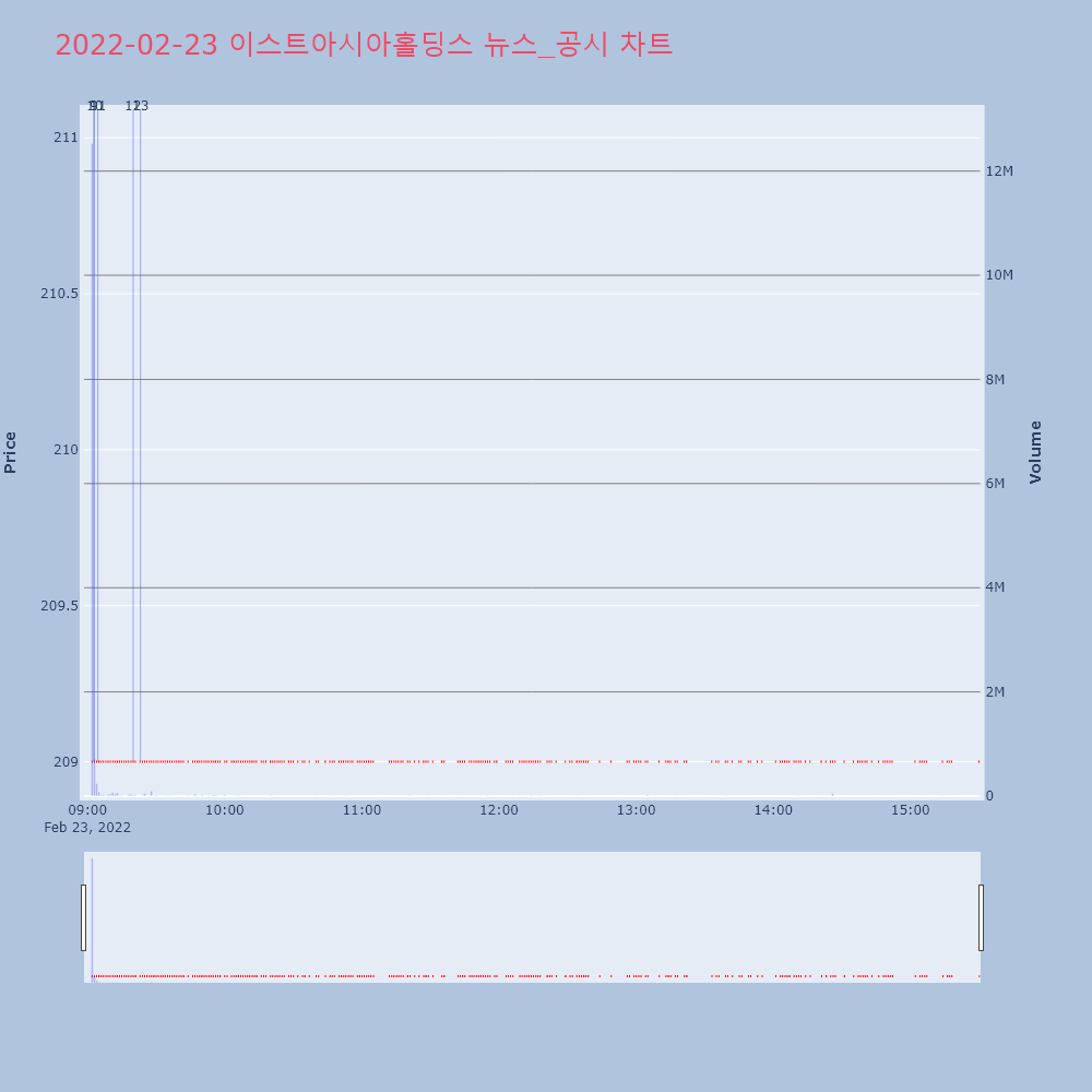 | 13 | 이스트아시아홀딩스, 타법인 지분 인수에 이틀째 상한가이스트아시아홀딩스가 그랜드엠파이어인터내셔널리미티드의 | 한경/증권 | 이스트아시아홀딩스 | 2022-02-23 09:23:08 |