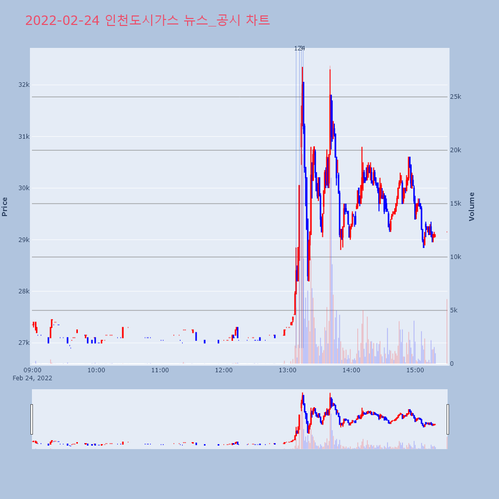 | 2 | 인천도시가스, +11.30% VI 발동인천도시가스(034590)가 VI가 발동했다. 전일 대 | 조선경제 | 인천도시가스 | 2022-02-24 13:11:18 |