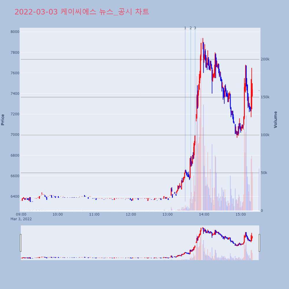 | 3 | 케이씨에스, +10.43% VI 발동케이씨에스(115500)가 VI가 발동했다. 전일 대비 | 조선경제 | 케이씨에스 | 2022-03-03 13:45:14 |