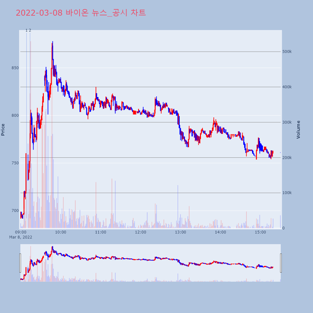 | 1 | 바이온, +9.83% VI 발동바이온(032980)이 VI가 발동했다. 전일 대비 9 | 조선경제 | 바이온 | 2022-03-08 09:08:46 |