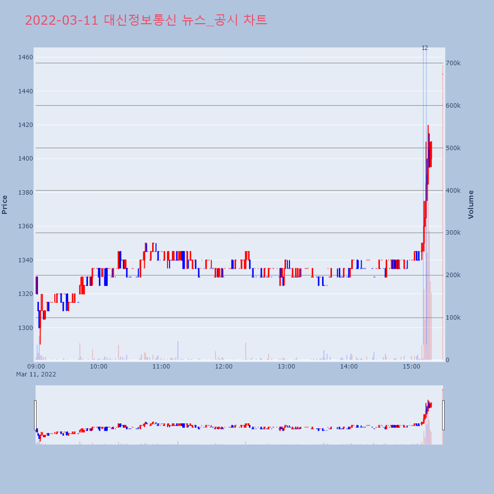 | 2 | 대신정보통신, +6.46% 상승폭 확대대신정보통신(020180)이 상승폭을 확대하고 있다. | 조선경제 | 대신정보통신 | 2022-03-11 15:14:17 |